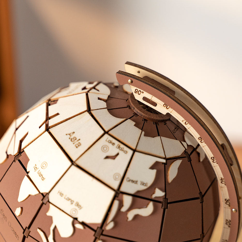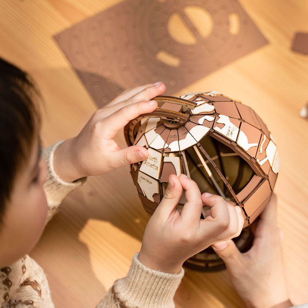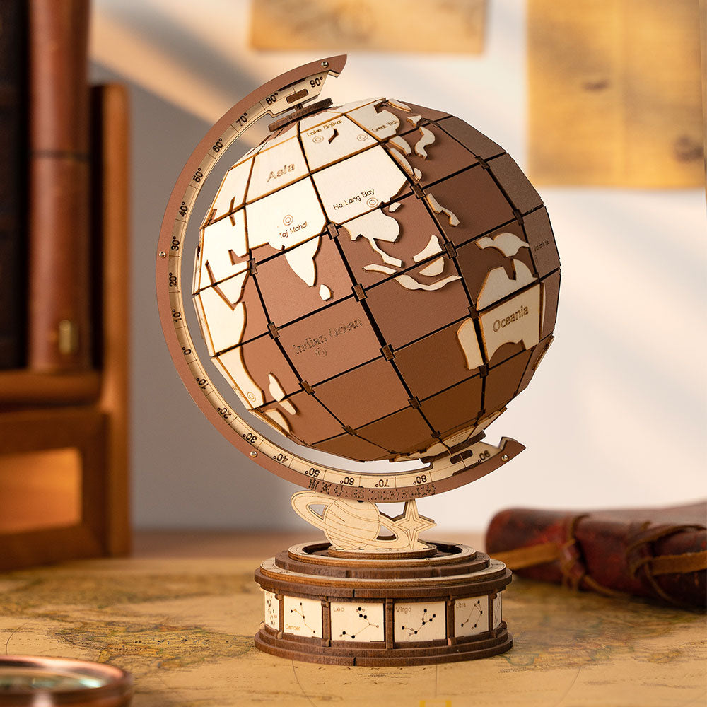 Explore the wonders of the world with Rolife Global Wonders 3D Wooden Puzzle. Take a trip around the globe and marvel at famous landmarks both natural and manmade. Jump through continents and readily identify where these tourist spots are. The "hidden" gem of this assembly is the Astronomical Clock at the base of the globe. This precious historical artifact from Prague's Old Town Hall is replicated by the rotating astronomical, calendrical, and zodiacal discs below the sphere. Aside from this historical significance, this special globe provides artistic and decorative appeal to any part of your home or office. A great educational tool, this 3D wooden puzzle informs and inspires you to dream of traveling and appreciate the world that we live in. Are you ready? Let the stars lead your way beyond the horizon.